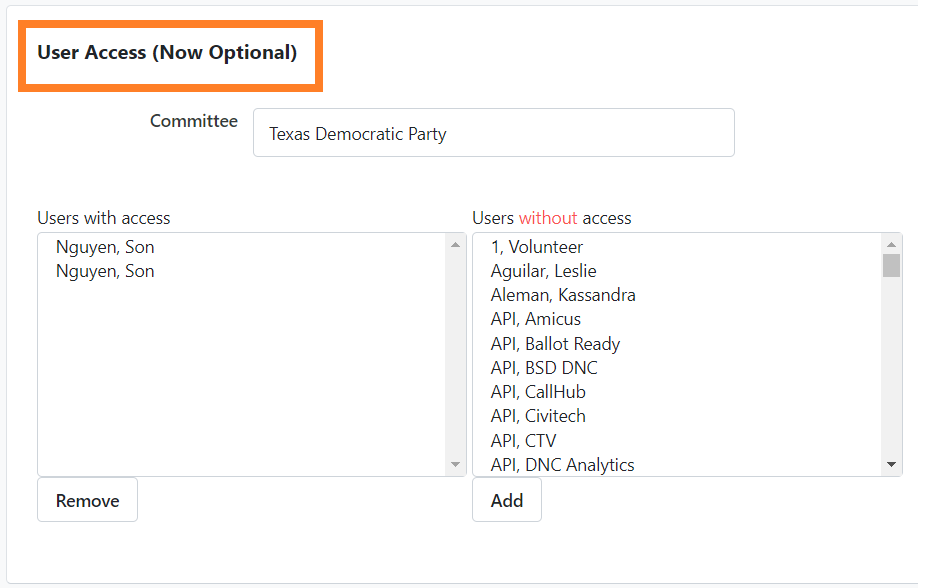 At the bottom of this page, you will see the User Access Panel that allows you to give specific VAN users, user groups and committees access to your list. Select the users you want to give access, and add them to the correct column. You can add the VPB with your committee by finding and adding your committee under Committee Access. Remember, when using an Open VPB link, callers without VAN accounts can also make calls as long as they have the correct code/link!