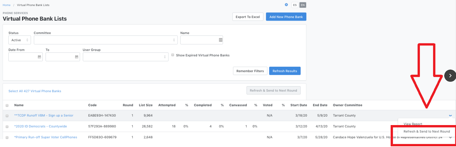 To get to Refresh & Send to Next Round, go to Home/Main Menu, find Administrative Menu and click Phone Services and then Virtual Phone Bank. When you are in the Virtual Phone Bank Lists page, find your VPB, then scroll all the way to the right side of your screen and find the dropdown arrow that will allow you to select Refresh & Send to Next Round.